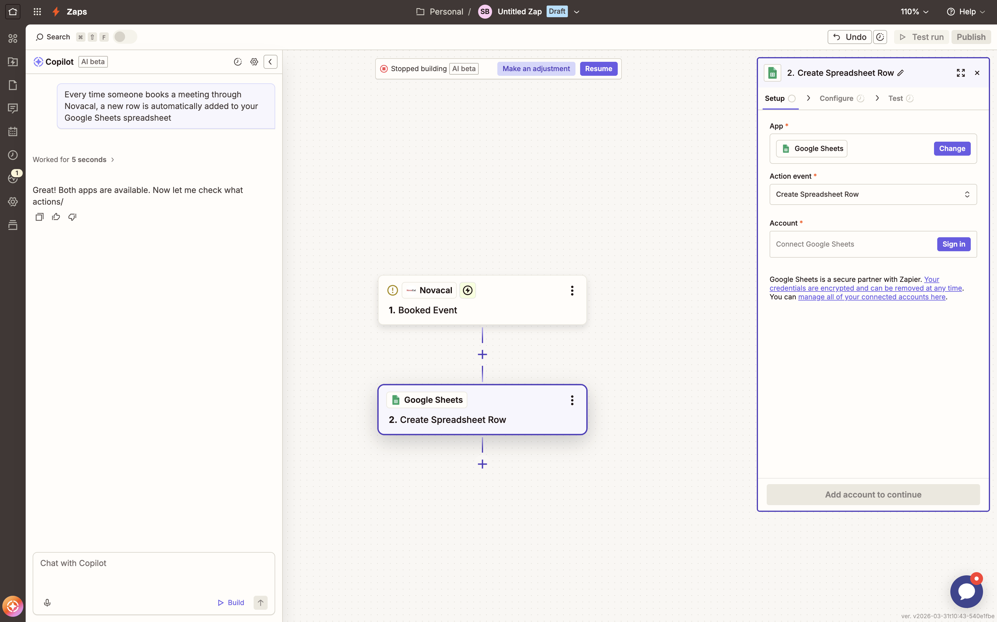 Novacal sends a webhook to Zapier whenever a booking is created, rescheduled, or cancelled. You can build Zaps that react to these events — for example, adding a row to Google Sheets, sending a Slack message, or creating a deal in your CRM. Multi-step Zaps let you chain multiple actions together from a single booking event.