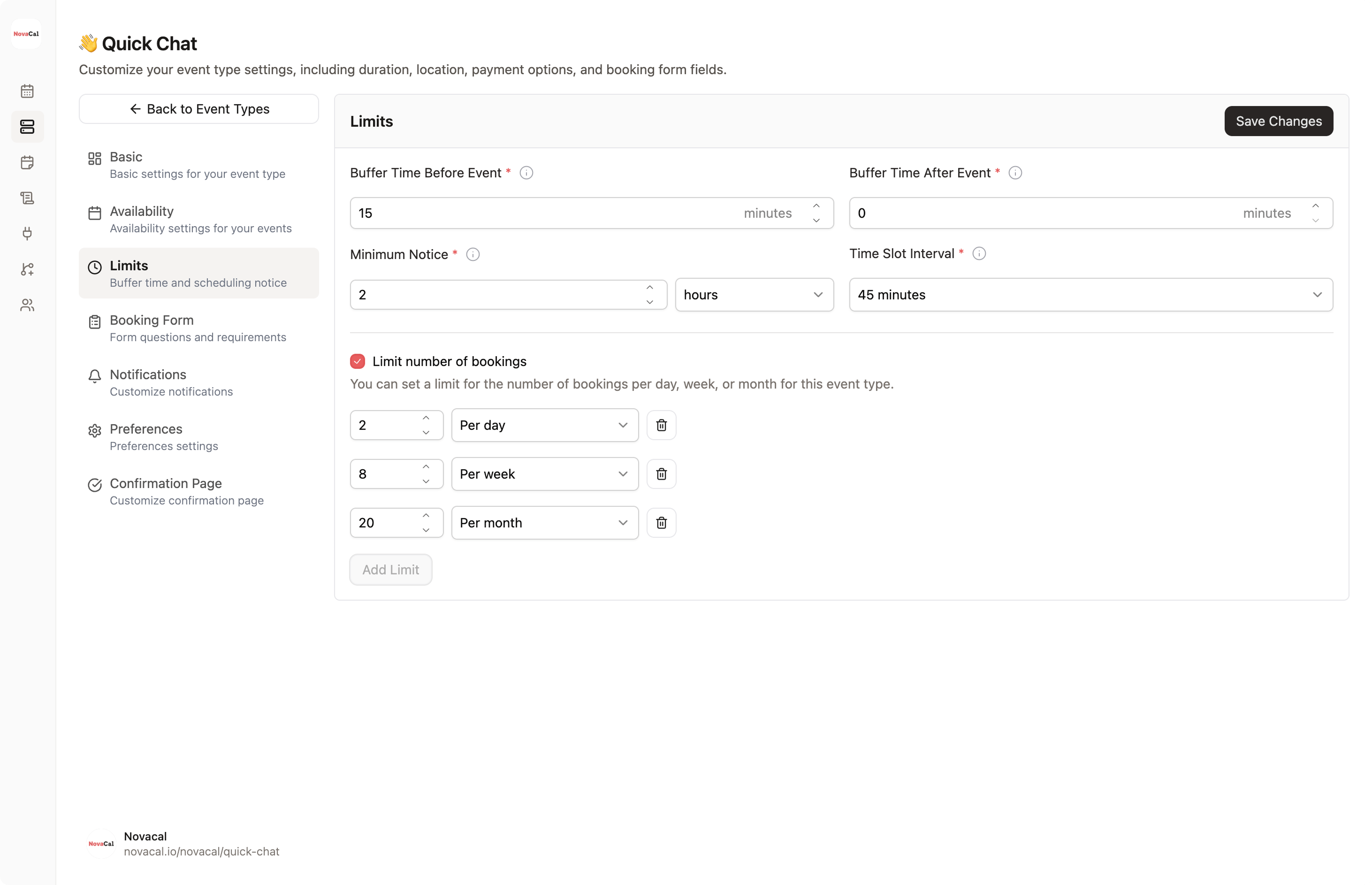 Not differentiating by meeting type: Your 15-minute intro call shouldn't have the same limits as your 2-hour workshop. Create separate event types in Novacal with appropriate limits for each.