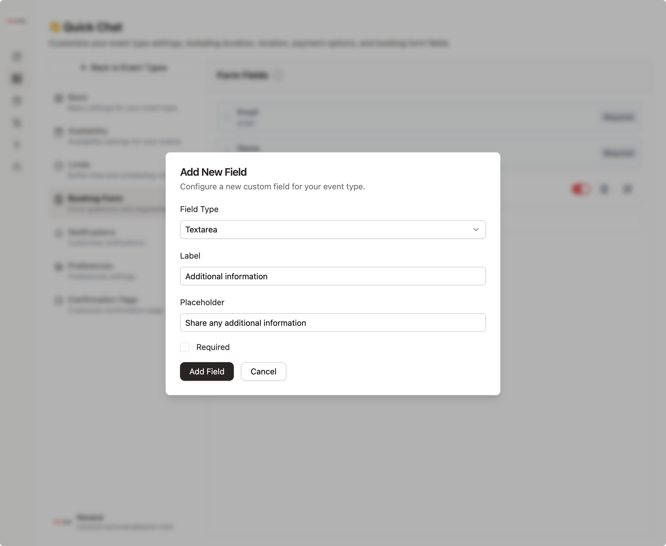 - Go to the Booking Form Section Once you've opened your event type settings, locate the booking form section. This is where you'll manage all the information you collect from clients.